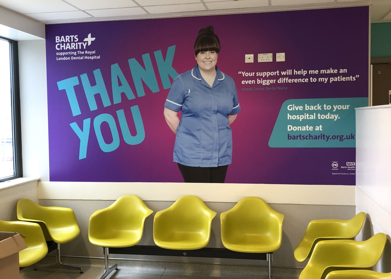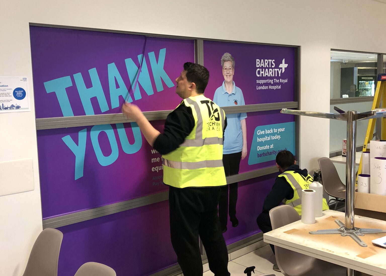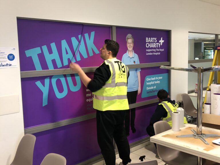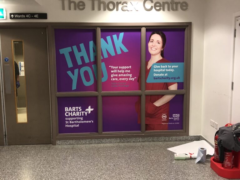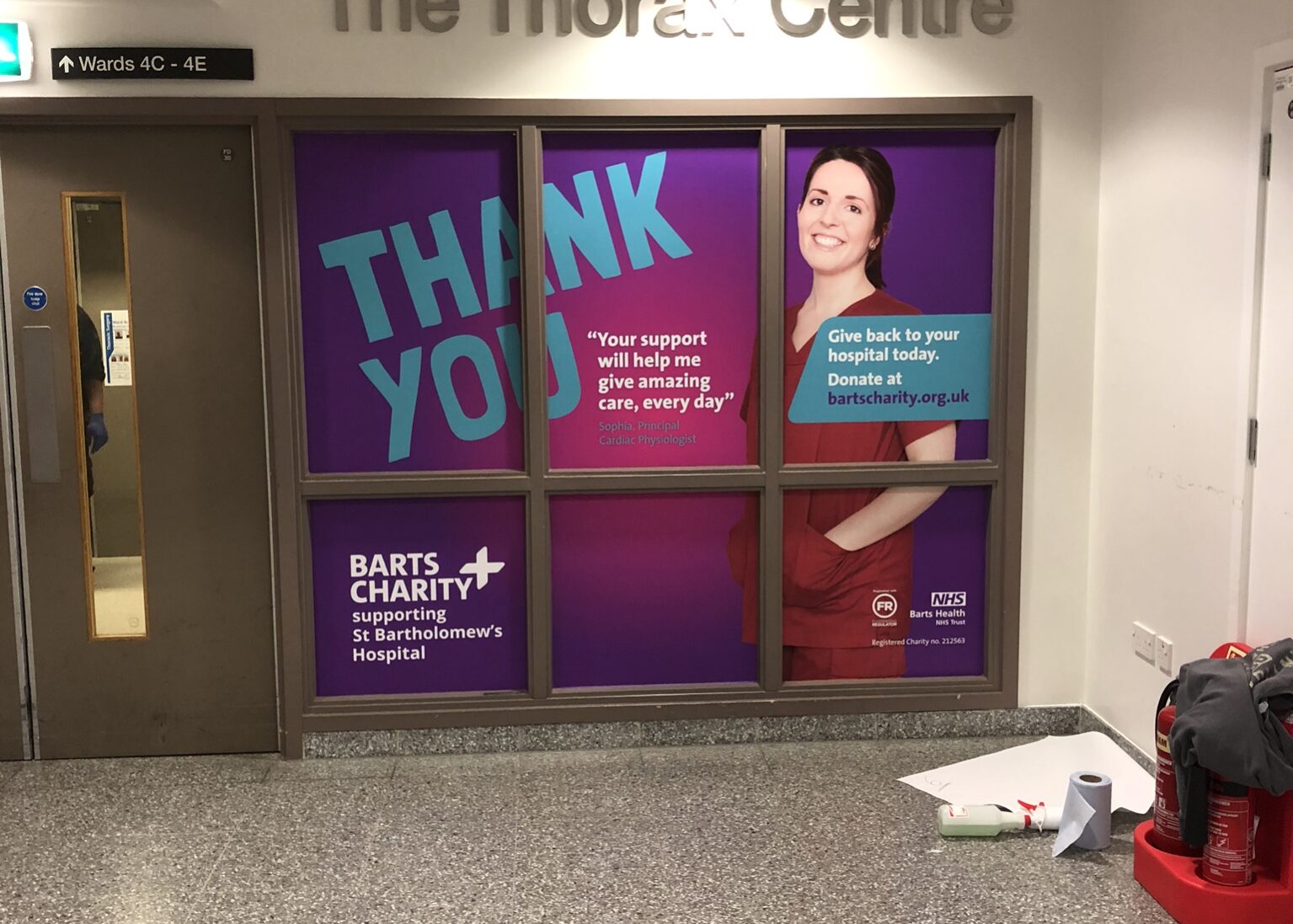 As the design company were based in Manchester and the Trust in London, we became the ‘on the ground’ project managers for the digitally printed graphics part of the promotion. We met with the client at the various hospital sites, discussed options on position, took photographs and took concise measurements of existing electrical sockets etc.